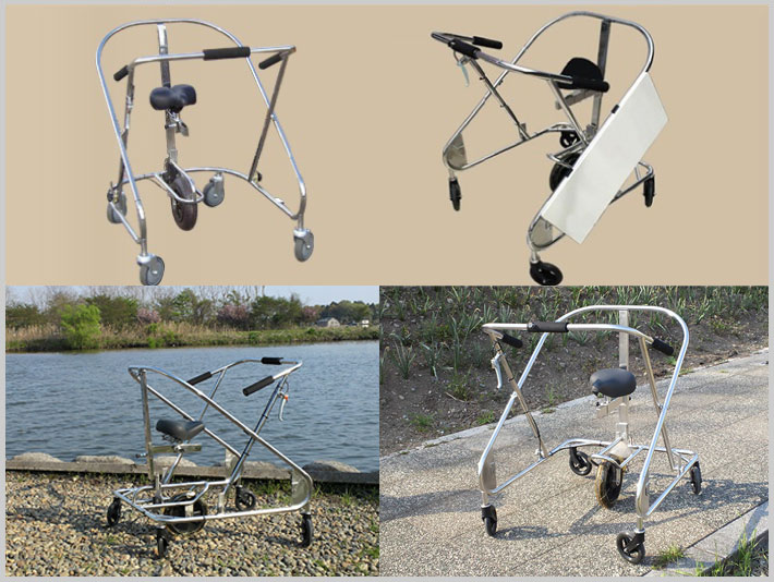 福祉関連 コスモウォーカー 自力での歩行が困難な方の歩行補助車です。 椅子に座ったままで、足を蹴る動作で前進、回転、後進ができます。(座位歩行訓練) 椅子に座らず、立った状態でもハンドルを押すようにしながら歩行ができます。(立位歩行訓練) 歩行で疲れたときには、椅子に座って休むことができます。 本機は転倒しにくい構造なので、訓練や外出用に活用できます。 折りたたみ機能を追加し、収納しやすくなりました。 商品名コスモウォーカー サイズ/寸法高さ940mm×幅640~740mm×長さ840mm 重さ約18kg 素材/材質フレームはステンレス製です。 色ブラック ご注意事項 フレーム周りのキャスターはあえて10mm程度浮かして取り付けています。 その他商品説明 歩行で疲れた時はいつでも椅子に座ることができます。椅子に座ったままで移動することもできます。これまで敬遠しがちだった遠出も可能にしてくれる商品です。